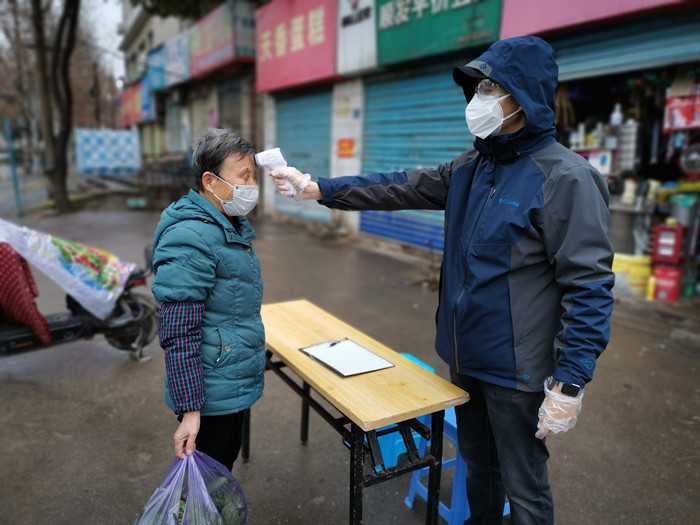 2月14日,青山區(qū)廠前街道鐵鋪嶺社區(qū)。武漢交投集團(tuán)黨員突擊隊(duì)員余皓、李慶濤早早地來(lái)到社區(qū)防控值勤卡點(diǎn)。這里是鐵鋪嶺社區(qū)平日最為繁華的菜市場(chǎng),一天忙碌的防控工作由此開(kāi)始。這一天兩名隊(duì)員身兼“數(shù)職”,既要當(dāng)好疫情防控的精準(zhǔn)摸排者和科學(xué)宣教者,還要當(dāng)好措施落實(shí)過(guò)程中的耐心勸導(dǎo)者。