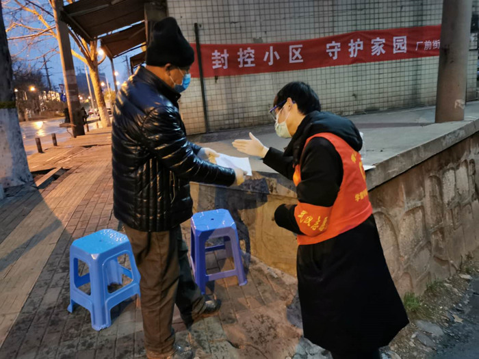 鐵鋪嶺社區(qū)由武鋼的4棟老單身職工宿舍和當(dāng)?shù)氐?0個(gè)村組組成,位于青山區(qū)和洪山區(qū)交界處,經(jīng)濟(jì)條件、生活環(huán)境和社會(huì)管理相對(duì)較弱,居民生活相對(duì)困難,人員關(guān)系十分復(fù)雜,外來(lái)人員、老病孤殘人員較多。無(wú)論晴天還是雨雪天氣,集團(tuán)黨員突擊隊(duì)隊(duì)員24小時(shí)全天值守,而嚴(yán)防死守也意味著直面危險(xiǎn)。2月19日下午,集團(tuán)黨員突擊隊(duì)隊(duì)員在值守過(guò)程中,小區(qū)有個(gè)患者需要在值守處轉(zhuǎn)運(yùn),120到達(dá)后,經(jīng)突擊隊(duì)值守人員核查和協(xié)助,病人順利上車,車門準(zhǔn)備關(guān)上的時(shí)候,患者突發(fā)緊急情況,摘下口罩朝車門外猛地吐出一大口血痰,飛沫四濺,而突擊隊(duì)員們當(dāng)時(shí)和患者距離不足1米,面對(duì)飛沫傳播的危險(xiǎn),集團(tuán)黨員突擊隊(duì)隊(duì)員不畏疫情、迎難而上,順利協(xié)助病人轉(zhuǎn)運(yùn)離開(kāi)。