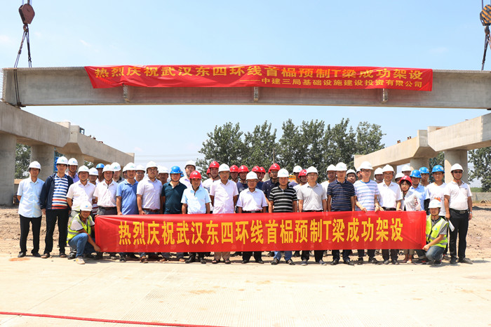 武漢東四環(huán)線起于武漢繞城高速北湖互通,終點(diǎn)與青山長江公路大橋銜接,全長8.182公里,雙向8車道,設(shè)計(jì)車速100公里/小時(shí),共建3座互通立交橋及2座特大橋,預(yù)計(jì)2019年底主線工程基本建成,此次首榀T梁的成功架設(shè)為東四環(huán)線早日通車、四環(huán)線早日畫圓打下了堅(jiān)實(shí)基礎(chǔ)。
