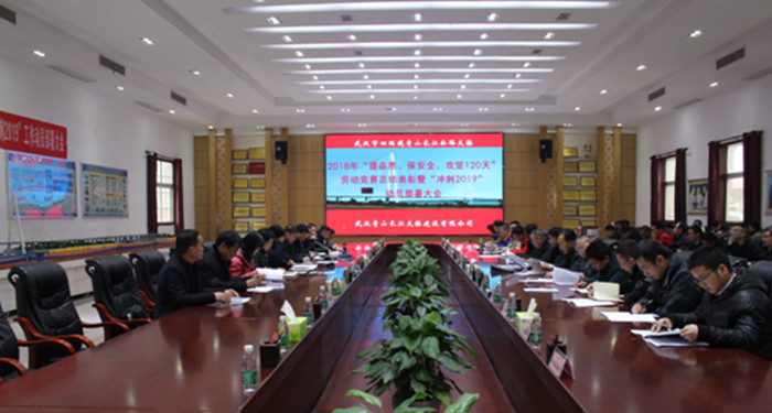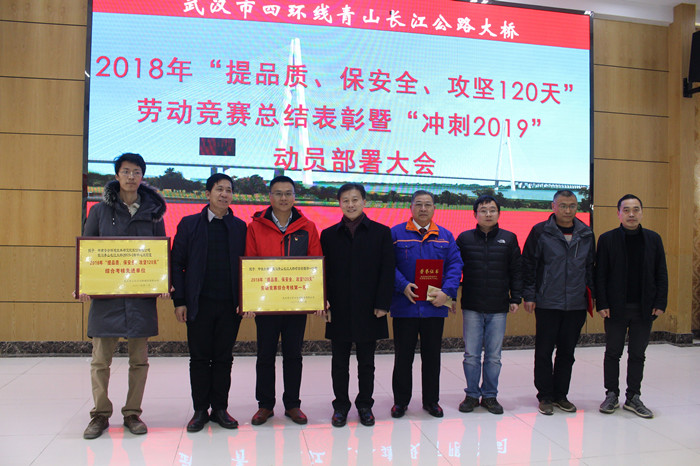 2019年1月18日下午,青山橋公司在天興洲會(huì)議室隆重召開2018年“提品質(zhì)、保安全、攻堅(jiān)120天”勞動(dòng)競(jìng)賽總結(jié)表彰暨“沖刺2019”工作動(dòng)員部署大會(huì)。武漢交投集團(tuán)總經(jīng)理、青山橋公司董事長陳順平,大橋局副局長張春新及各參建單位領(lǐng)導(dǎo)出席會(huì)議。