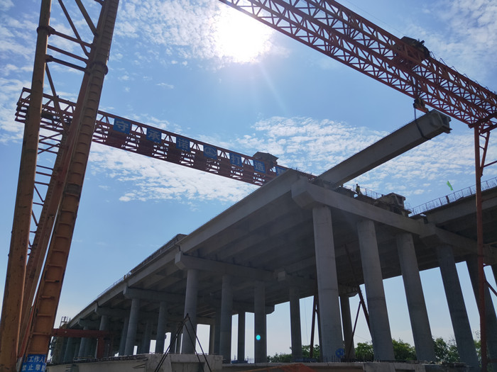 當(dāng)日下午,在黃陂區(qū)新十公路松樹(shù)崗施工現(xiàn)場(chǎng),架橋機(jī)正在架設(shè)最后一跨40米的簡(jiǎn)支箱梁。北四環(huán)第三標(biāo)段主要負(fù)責(zé)1.155公里的橋梁施工,其中包含4跨連續(xù)梁水平轉(zhuǎn)體施工,以及17孔212片箱梁架設(shè)施工。去年11月,該標(biāo)段成功完成4座轉(zhuǎn)體橋的轉(zhuǎn)體工程,這也是國(guó)內(nèi)首次一個(gè)項(xiàng)目在1公里范圍內(nèi)有連續(xù)4座轉(zhuǎn)體橋,也是國(guó)內(nèi)最密集的轉(zhuǎn)體群,轉(zhuǎn)體群總重量更是高達(dá)創(chuàng)紀(jì)錄的11.5萬(wàn)噸。