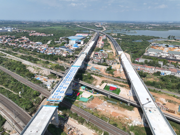 武大高速跨鐵路立交橋跨越京廣鐵路上下行客運(yùn)線及貨運(yùn)線、武漢北編組站、新港上行線等9條既有鐵路營(yíng)業(yè)線。