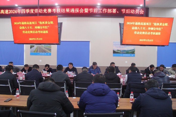 2025年1月15日,武漢交投通修高速建設(shè)管理有限公司組織召開四季度勞動競賽考核結(jié)果通報會暨節(jié)前工作部署、節(jié)后動員會。項目公司領(lǐng)導(dǎo)班子及各部門負(fù)責(zé)人,中心試驗室主要負(fù)責(zé)人,設(shè)計代表,駐地辦正(副)駐地監(jiān)理工程師,各標(biāo)段后方公司領(lǐng)導(dǎo)、項目經(jīng)理等參會。