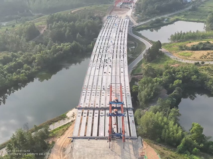 該橋位于武漢市新洲區(qū)鳳凰鎮(zhèn)毛家沖村,橫跨毛家沖水庫,全長337米,設(shè)計為3聯(lián)11跨,施工中嚴格采用預(yù)應(yīng)力后張法先簡支后連續(xù)的先進箱梁施工工藝,項目團隊克服技術(shù)難點,高效完成了全部110榀箱梁的預(yù)制、運輸及架設(shè)任務(wù)。
