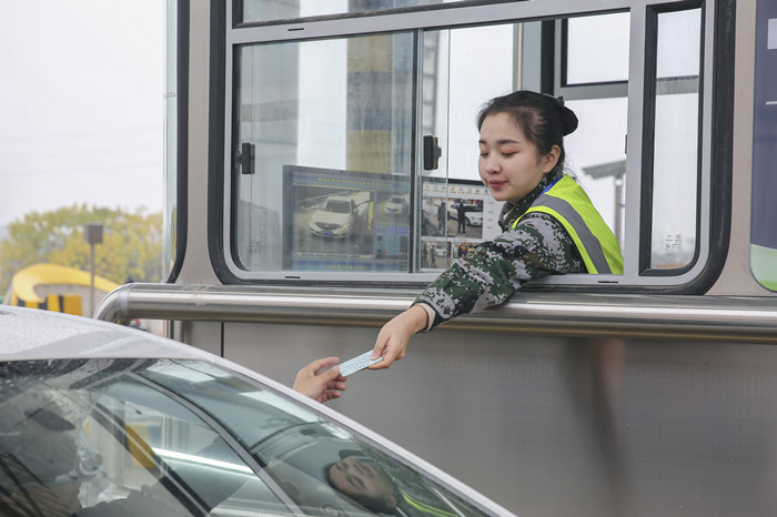 12月26日12點(diǎn),收費(fèi)員為駛?cè)胛渖罡咚俸倍谓鸶凼召M(fèi)站的第一臺(tái)車(chē)輛發(fā)放通行卡