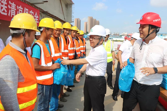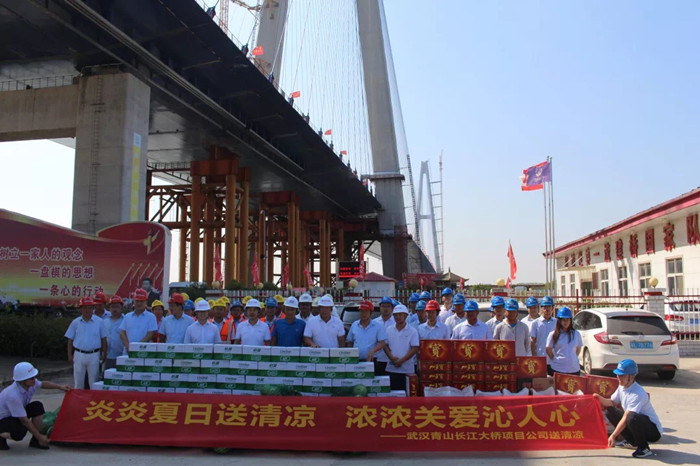 青山橋公司開展“炎炎夏日送清涼,濃濃關(guān)愛沁人心”為主題的“送清涼”活動。在青山長江大橋施工現(xiàn)場,公司總監(jiān)李朝陽、總經(jīng)理助理胡永勝把防暑降溫用品送給一線產(chǎn)業(yè)工人手中,將關(guān)懷送到全體員工心里;