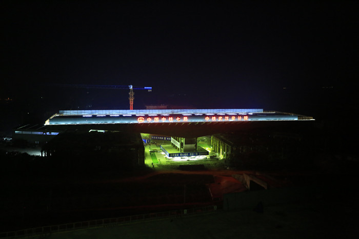 當(dāng)天00時50分,隨著一聲令下,總長142米、寬42.9米、重3.3萬噸的梁體,在2臺600噸千斤頂及牽引索的拉動下,逆時針旋轉(zhuǎn)87.47度至設(shè)計位置,成功跨越武漢北下行環(huán)發(fā)線、京廣貨線下行2條鐵路線,于2時40分轉(zhuǎn)體精確就位。