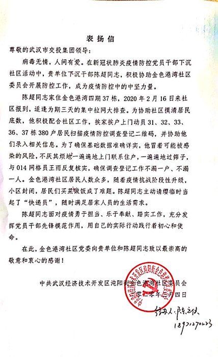 3月4日,全國第57個學雷鋒紀念日前夕,武漢交投集團收到一封來自經(jīng)濟技術開發(fā)區(qū)沌陽街金色港灣社區(qū)的表揚信,點名表揚集團下沉干部陳超同志防疫期間勇于擔當、主動服務的先進事跡。