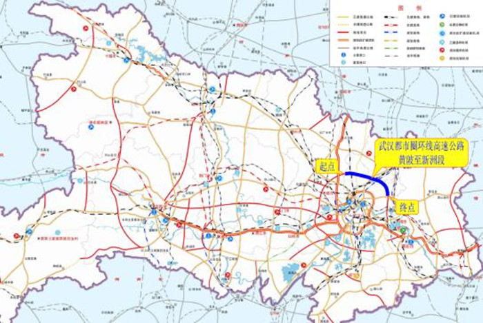 G9906武漢都市圈環(huán)線高速公路黃陂至新洲段項目起于武漢市黃陂區(qū)李家集街與孝感市孝南區(qū)交界的界河,與武漢都市圈環(huán)線高速公路孝感北段對接,向東經(jīng)黃陂區(qū)李家集街、羅漢寺街王家河、蔡家榨,經(jīng)紅安縣太平橋鎮(zhèn)南側(cè)向東跨倒水河后向東南展線,止于武漢市新洲區(qū)邾城街西側(cè)的劉集,與在建的新港高速雙柳長江大橋及接線工程對接。