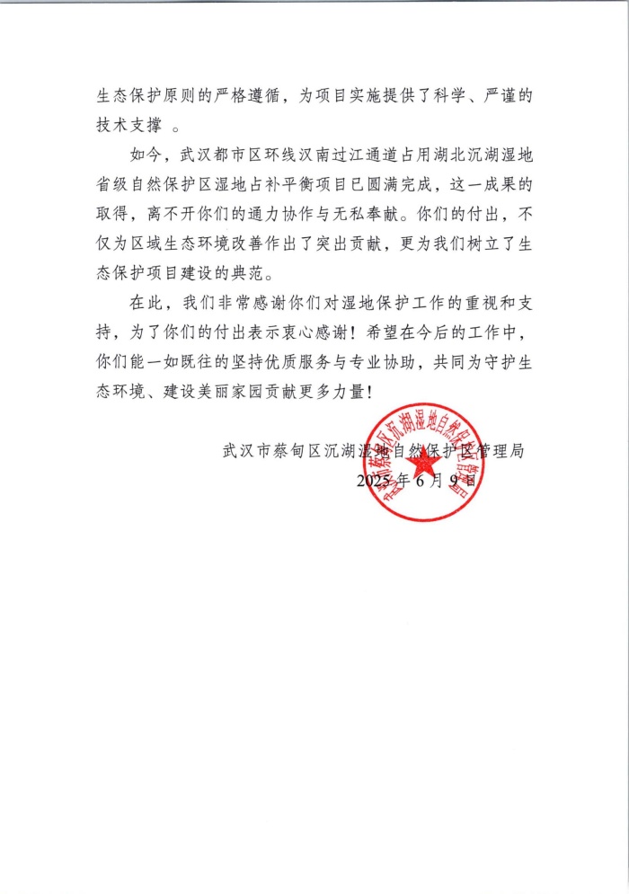 初夏六月,荷尖初露,武漢都市圈環(huán)線高速公路漢南長江大橋及接線工程沉湖濕地保護(hù)區(qū)內(nèi)蛙鳴漸起、蒲草搖曳,處處涌動(dòng)著蓬勃生長的活力。在這萬物競發(fā)的美好時(shí)節(jié),項(xiàng)目團(tuán)隊(duì)收到了來自蔡甸區(qū)沉湖濕地自然保護(hù)區(qū)管理局的感謝信。信中特別指出,項(xiàng)目團(tuán)隊(duì)以科學(xué)的生態(tài)修復(fù)方案和高效的執(zhí)行能力,在重大交通基礎(chǔ)設(shè)施建設(shè)與濕地生態(tài)保護(hù)間找到了平衡點(diǎn),繪就了建設(shè)發(fā)展與生態(tài)保護(hù)同頻共振的和諧圖景,為同類項(xiàng)目樹立了標(biāo)桿。這也標(biāo)志著該項(xiàng)目濕地“占補(bǔ)平衡”工作圓滿收官,在兼顧生態(tài)效益與工程可行性具體實(shí)踐路徑上又探索出了新路徑。