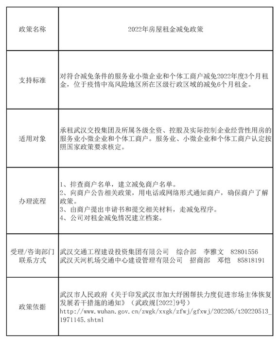 武漢交投集團(tuán)2022減免服務(wù)業(yè)小微企業(yè)和個體工商戶房屋租金政策公眾指南