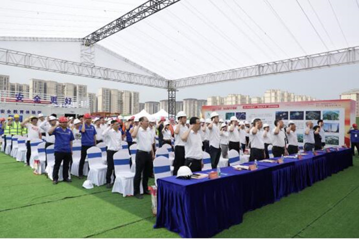 活動中,施工、監(jiān)理單位代表作表態(tài)發(fā)言,全體參會人員進行了集體安全宣誓,集中觀看了應急演練視頻,并在盛世國際文體項目實體安全體驗區(qū)進行了現(xiàn)場觀摩。